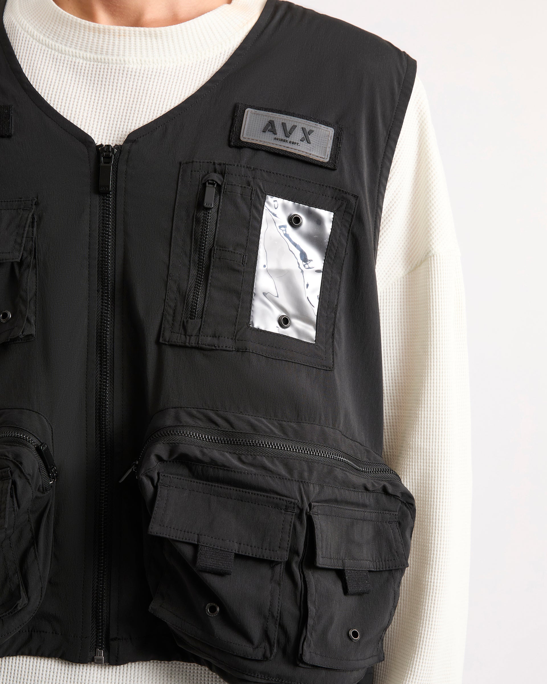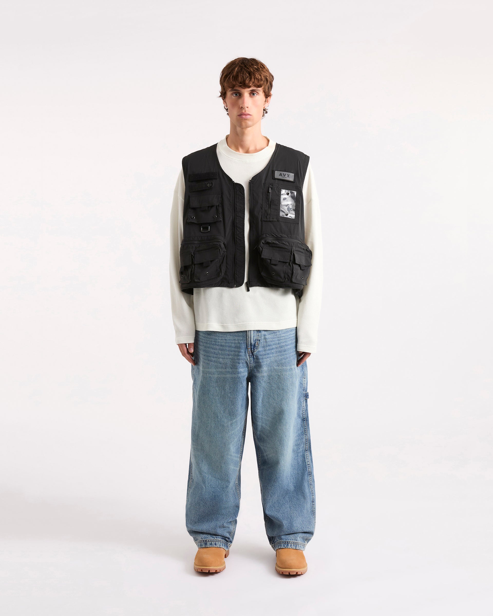 The Carp Gilet is a cropped utility vest reworked for modern layering. Made from a polyester-elastane blend, it features multiple pockets and hardware details with a metal branded badge, eyelets, buttons, and a D-ring. Pair it with our Tact Cargo Pant for the complete look.